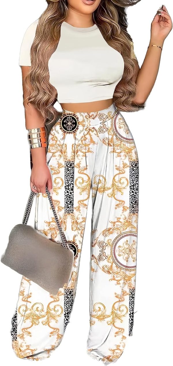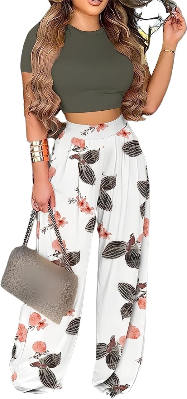2 Piece Outfits for Women Casual Wide Leg Pants Set Outfits Sexy Front Crop Tops High Waist Jumpsuits Set