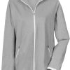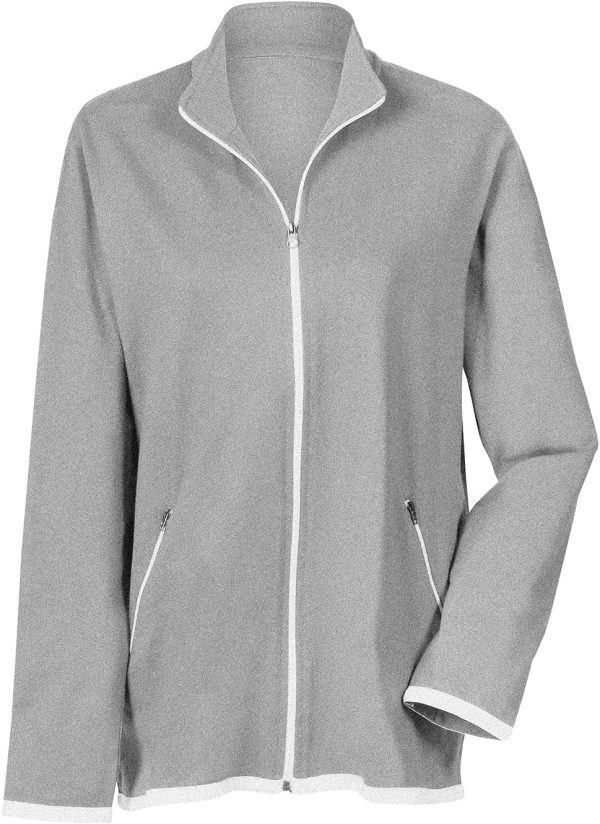 The white contrast zipper matches the white piping on the cuffs and hem.